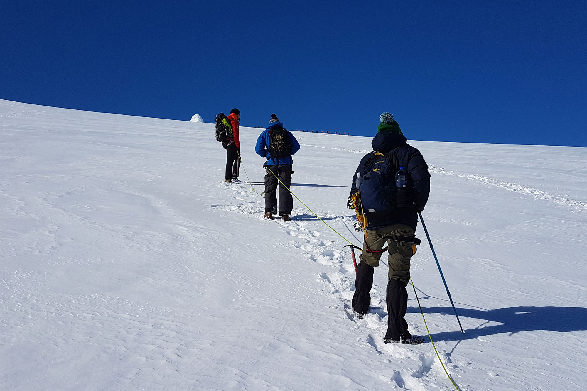 Hópurinn hittist við Arnarstapa Center klukkan 10:30 þar sem farið verður í samfloti upp að jökulbrúninni. Við mælum því með að leggja ekki síðar af stað frá Reykjavík en kl 8:00 um morguninn. Þegar komið er inn á jökulinn verður gengið í línu upp að hinum einkennandi blómkáls-toppi Snæfellsjökuls. Búast má við því að gangan upp taki um 3-4 klukkustundir. Þegar upp á topp er komið virðum við fyrir okkur magnað útsýnið, fáum okkur nesti og njótum þess að standa á toppinum á þessu glæsilega sofandi eldfjalli.