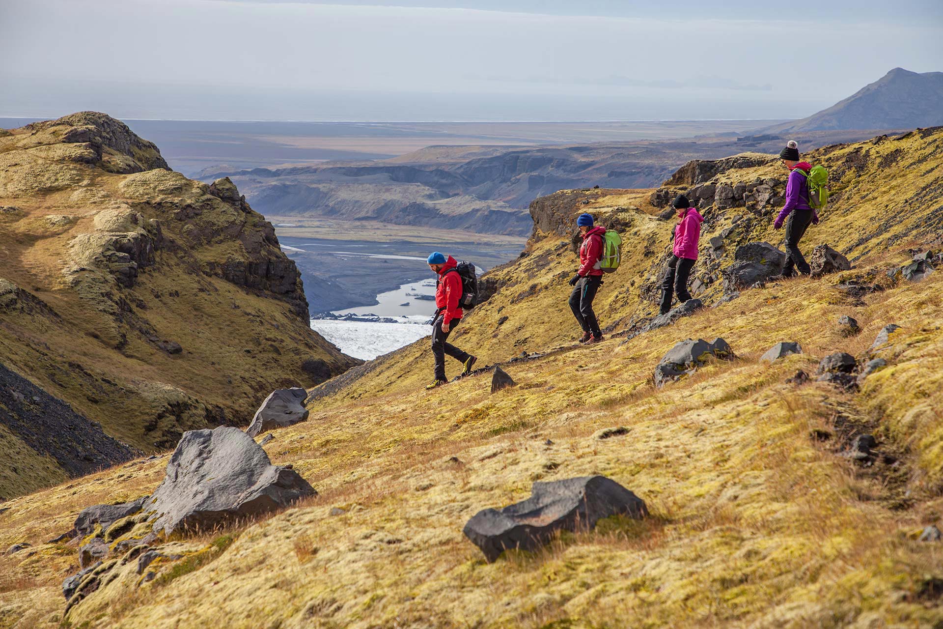 Við hittumst á bílastæðinu fyrir framan Sólheimajökul. Leiðsögumaður tekur á móti hópnum og ekur honum stutta vegalengd að höfuðstöðvum Arcanum undir Mýrdalsjökli. Þar er farið í stærri bíl sem keyrir hópinn upp í 750m metra hæð þar sem gangan hefst. Á göngunni sér maður bersýnilega hvernig jöklar landsins hafa mótað landslagið. Gangan er að mestu leiti niður í móti þar sem gamalli smalaleið er fylgt meðfram jökulrönd Sólheimajökuls. Á leiðinni njótum við útsýnisins yfir suðurlandsundirlendið, yfir jökullinn og fetum okkur í gegnum gil niður meðfram jökulröndinni. Ferðin endar á bílastæðinu við Sólheimajökul þar sem bílarnir bíða eigenda sinna.