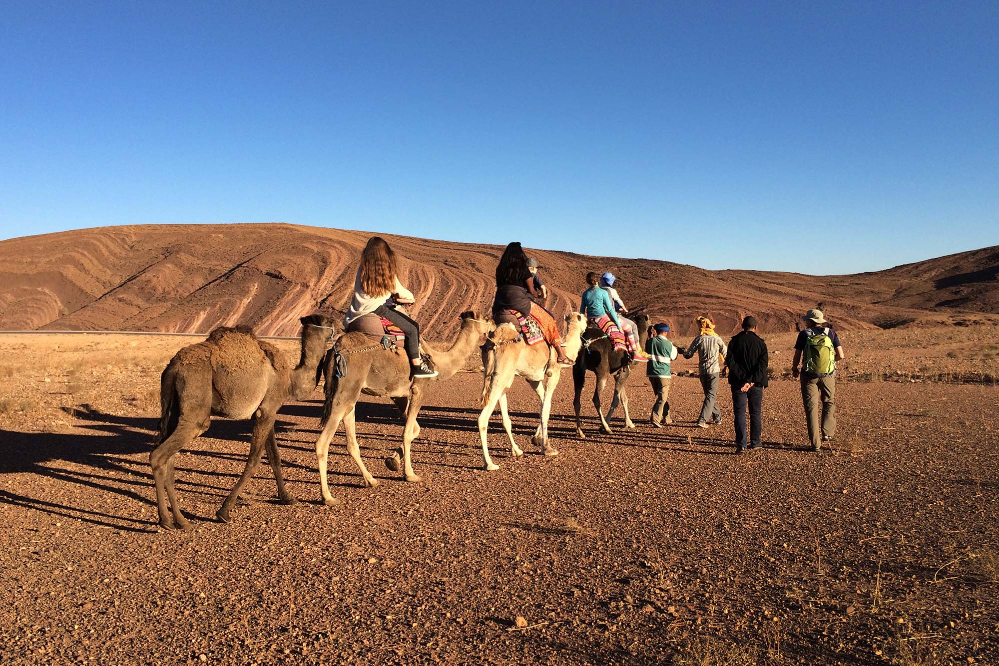 Fyrsti dagurinn okkar á ferð með úlföldunum og framundan er eyðimörkin, sjálf Sahara eða í það minnsta örlítill hluti hennar þar sem við höldum í fótspor eyðimerkurfara fortíðarinnar. Úlfaldarnir eru ekki að flýta sér og hraði okkar miðast við það, við göngum með þeim og ef þreyta fer að gera vart við sig þá getum við skellt okkur á bak. Við höldum upp í Tizi n´Oujgal og yfir til Tizi n´Inejdane þaðan sem við njótum ómótstæðilegt útsýnis yfir eyðimörkina sem teygir sig eins langt og augað eygir. Landslaginu hér svipar til Hoggar fjallanna í mið Sahara, þar sem tenntir hryggir og stakar klettamyndanir standa upp úr sandinum. Á nýsteinöld bjó fólk á þessu svæði og má sjá minjar þess í hellaristum. Við setjum upp tjaldbúðir nálægt Ait Ouazzik. Gist í tveggja manna tjaldi. Morgunverður, hádegisverður og kvöldverður. 4 – 5 klst ganga