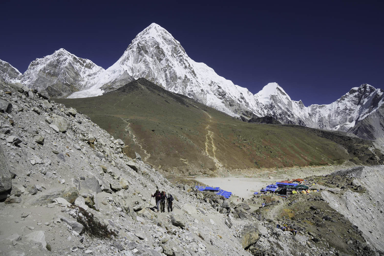 Stuttur göngudagur yfir í grunnbúðir Everest sem eru iðandi af lífi þessa dagana. Það er fágætt að göngumenn fái að gista í Grunnbúðunum. 3ja -4ra tíma ganga, ca. 6 km. Gist í tjaldi, fullt fæði.