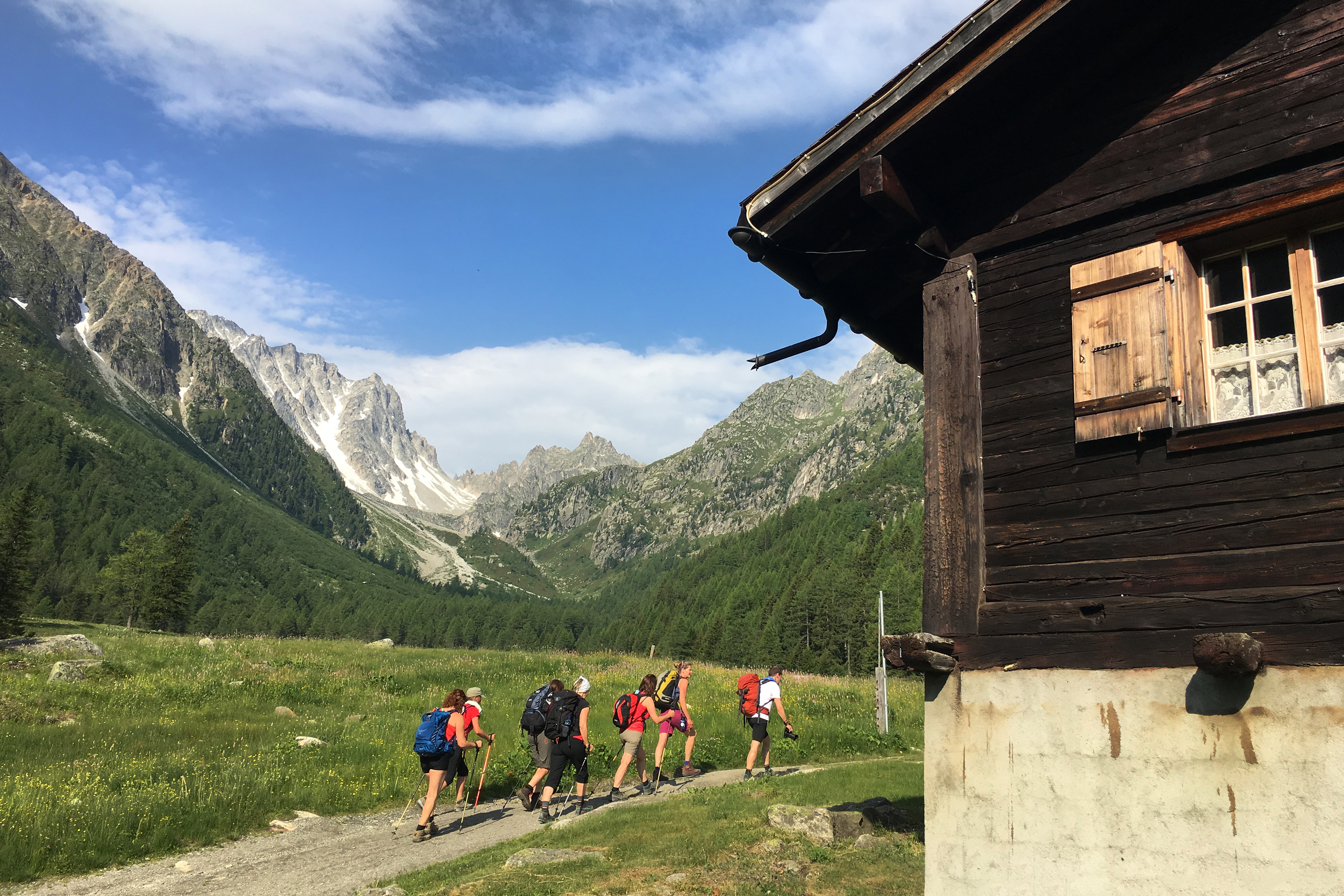 Við höldum ferð okkar áfram inn Ferret dalinn og lækkum okkur eftir tilkomumiklum stíg til la Vachey (1650 m) með ómótstæðilegt útsýni yfir brattar hlíðar Mont Blanc. Við höldum áfram upp á við og komun næst að Elena skálanum þar sem síðasti séns er að fá sér ekta ítalskan espresso bolla. Við höldum svo upp í Grand Ferret skarðið sem skilur að Ítalíu og Sviss. Útsýnið er tilkomumikið yfir Grandes Jorasses og Mont Dolent fjöllin sem hverfa sjónum þegar við lækkum okkur niður í svissneska Ferret dalinn. Við La Peule getum við kastað mæðinni og fengið okkur kaffi áður en við göngum síðasta spölinn niður að Ferret (1705) þaðan sem við tökum strætó að bænum Champex (1466 m) þar sem við gistum á gistihúsi. Hálft fæði
